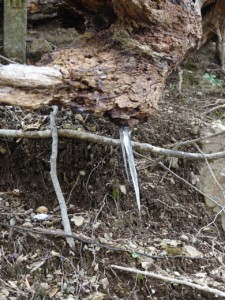 4月に入ったというのに、寒波到来で大山は雪化粧、この寒空に幅6mくらいの渡渉となり靴を脱いでサンダルで水の中に! 冷たい痛みをこらえて、無事渡りきり、いよいよ北尾根のとりつきを探して、登山開始。