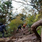 男坂と女坂の分岐で一旦止まり、男坂は鎖が続くので注意が必要であることを説明し、技量に合わせて各自コースを選んでもらった。鎖場に慣れたメンバーは念のため鎖場に慣れていないメンバーのフォローをすることにした。