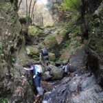 30分ほど登ると、今回の山行のハイライトでもある沢沿いの登山道となった。落ち葉で踏み跡が不明瞭なところもあったが、三点支持が必要な鎖場も眼前に現れ、渡渉を繰り返しながら、沢登りのような感覚で岩場歩きを楽しむことができた。