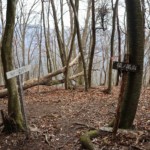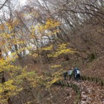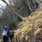 一旦、登山道が途切れて林道を横切り、ふと見上げると見事な急登もあり、「ゆっくりお願いしますね」との掛け声のもと、世間話に花を咲かせながら、ふかふかの落ち葉を一歩一歩踏みしめて登った(2、3回、天気の話をすると、そのたびに雨がぽつぽつ降りだしたので、お天気の話はしないようにした(偶然?天気の神様っているの?))。