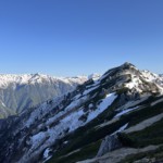 2日目: 曇り空で出発、少し早めにスタートした、風はなく急登を歩くと暑く、Tシャツで登る人もいたくらい。残雪期の服装選びは難しい。雪は少なかったが、第三ベンチで念のためアイゼンを装着。合戦尾根からは前爪が必要だったが、ピッケルは不要だった。合戦尾根からの見事な景色に感動しながら、予定よりも早く燕山荘に到着、のんびりと景色を堪能しながら燕岳に登頂。テント泊組は、設営に時間をとられて少し遅れて山頂に行ったあとに雷鳥に遭遇できた。先発隊は悔しい思いをしていたが、霧雨となった夕食直前に雷鳥が玄関近くにお目見え、白い雷鳥に一同大満足。
