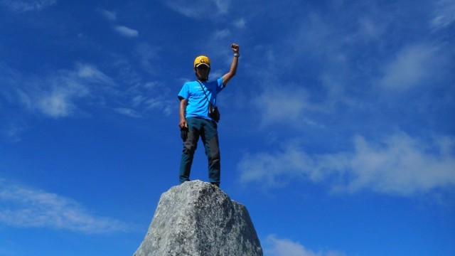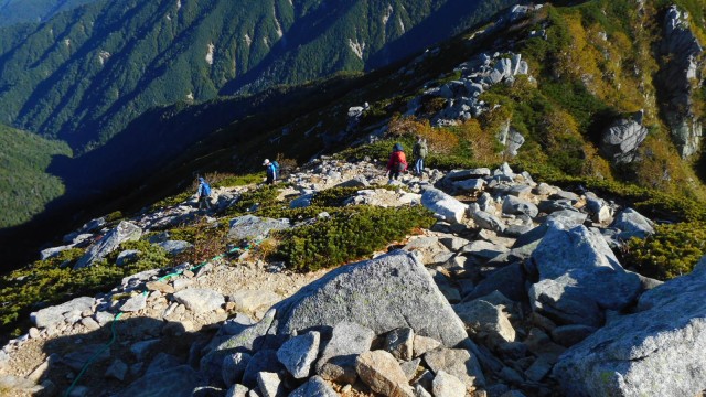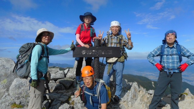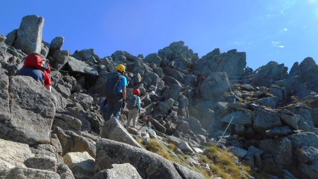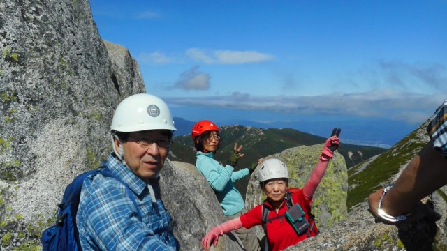 3. 小屋ではすぐに部屋に入ることができたので、部屋に荷物を置いて軽装で宝剣岳へ出発した。トップの岩へは皆怖じ気づき1人だけが登った。他の登山者が来るまで充分スリルと景観を楽しむことができた。