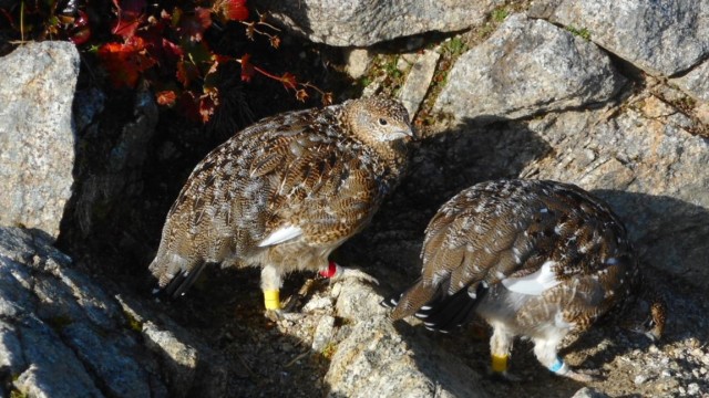 2. 登山口そばの神社で、オコジョが穴の出入りを何度もしており、眺めていると5cmぐらいのネズミを咥えて我々に見せつけるように出てきたのには驚いた。また駒ヶ岳山頂では6羽の雷鳥の群れと出会い、一度にこれほどの多くの雷鳥に出くわしたのは初めてであり感動した。また鳴き声も始めて聞いたような気がする。さらに、8合目付近から遠く前方に猿の姿を見掛けるなど、生き物との出会いが多かった。
