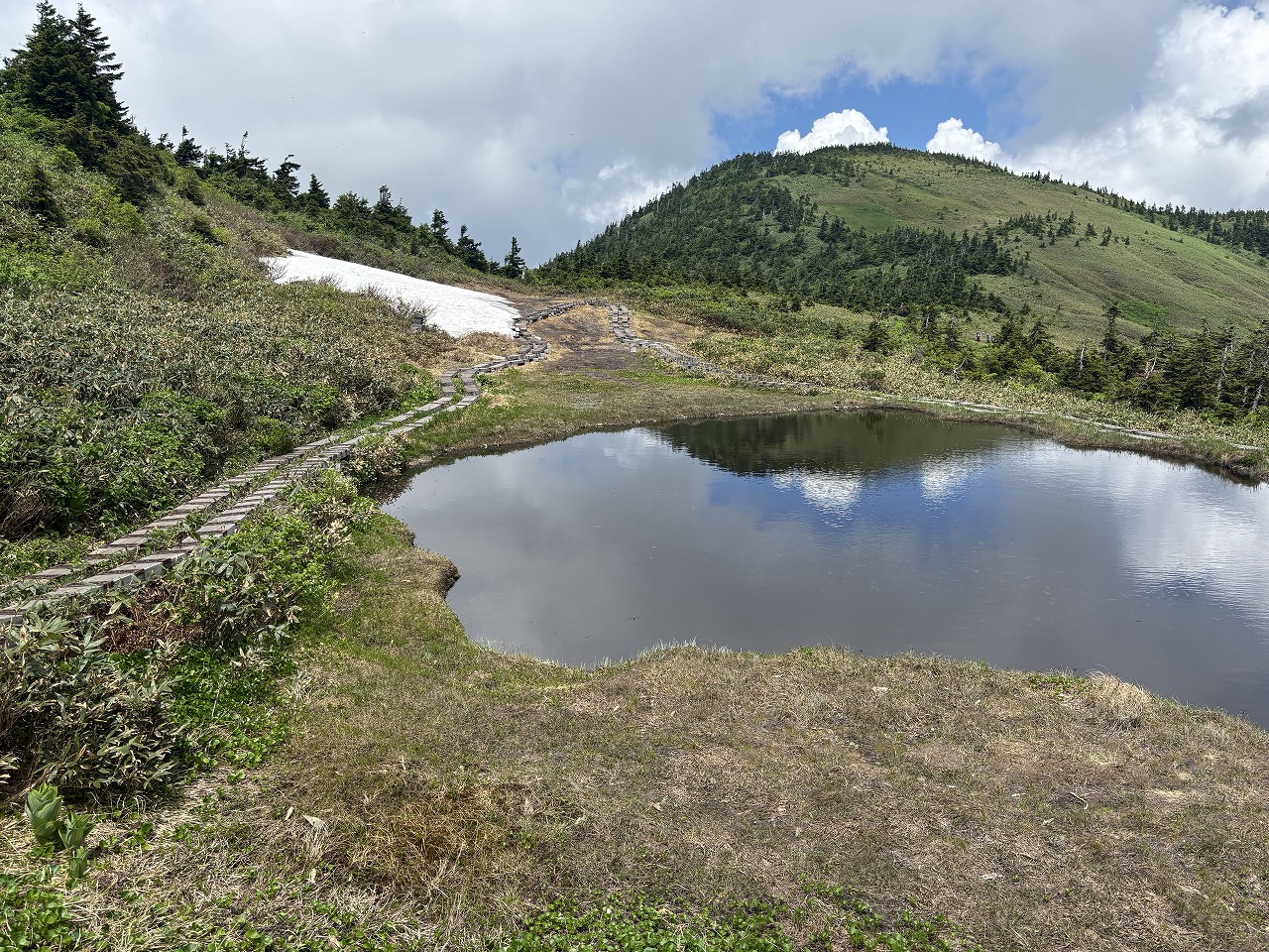 ● 会津駒ヶ岳【歩行距離:13.9km、累積標高差:±1,200m】 ・滝沢登山口からはいきなりの急登で、途中の水場で一服して“駒の小屋”まではひたすら登りが続く。しかしながらここからが圧巻で、“天空の楽園”と呼ばれる中門岳までの高原歩きは最高であった。会津駒までのピークハントで降りてくる方もおられるようだが、天空の楽園歩きは外さないことをお薦めしたい。 ・後ろ髪を引かれる思いで“駒の小屋”を後にして下山にかかると、黒い雲と遠雷が徐々に近づいてきて、「あと30分我慢して!」と祈りながら下山口近くまできたところでザーっと降られてしまった。雨具とザックカバーの装着に取り掛かるが、直ぐに整う人とそうでない人との差が表れ、準備の重要性を再認識させられる一幕となって、「この雨もよしとしよう!」ということで落着した。 ・会津駒ヶ岳で出会った主な花々:ハクサンコザクラ、チングルマ、イワイチョウ、コバイケイソウ、ショウジョウバカマ etc.