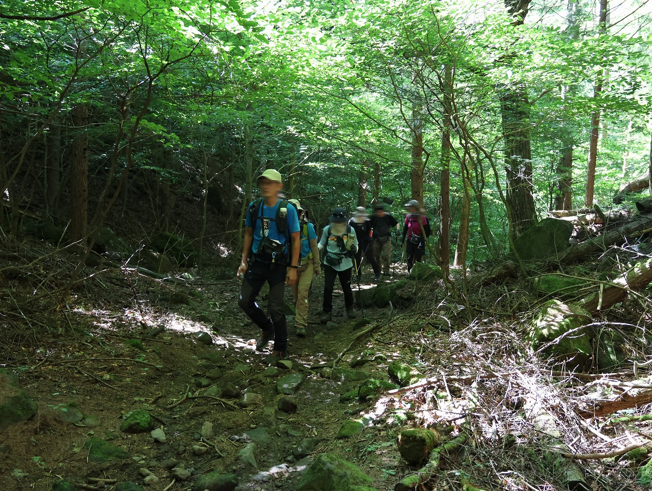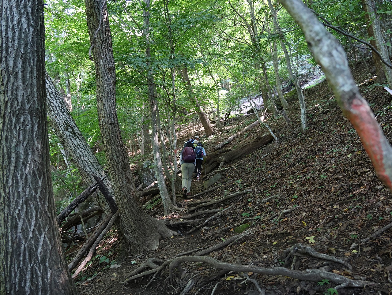計画通りに登山口駐車場に到着、半分程度駐車している車あり、到着時の車外温度は25°、そこそこ涼しい感じで準備・トイレを済ませ体操後登山を開始した。ひたすら森の中を歩き徐々に高度をあげていく、風もないためか汗が止まらない・・・、水分補給の休憩を入れながら女岩まで登ってきたが事前情報にあった通り、進入禁止になっていたので、少し登ったところからが女岩らしい所を確認。