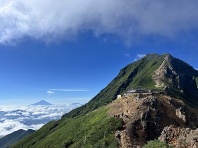 天気に恵まれ、真っ青な青空に生える硫黄岳、赤岳を仰ぎ見ることができた。赤岳から仰ぎ見た富士山は格別だった。八ヶ岳の山々の素晴らしい景色を望むことができた。