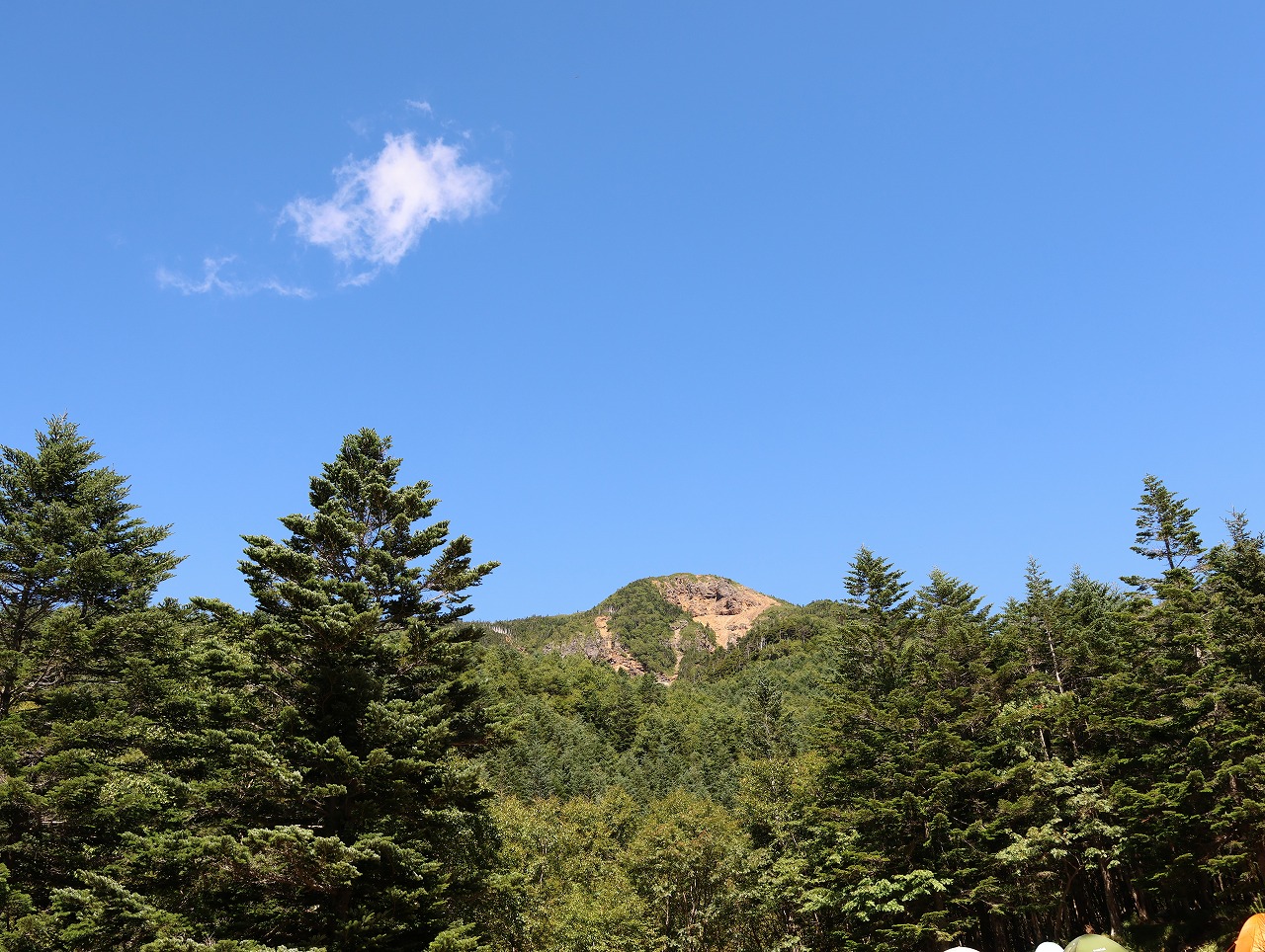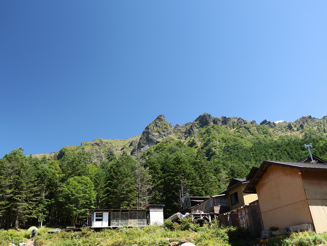 本来は美濃戸(赤岳山荘)まで車で行く予定だったが、美濃戸の駐車場が満車と判断して、手前の美濃戸口に駐車した。このため歩行時間が1時間近く増え、テント泊の4人にとってはかなりきつくなってしまった。 しかし、美濃戸までの道は4WDが推奨されている通りとても荒れていることが確認できたので、普通車の我々は手前で駐車して正解だった。このため初日の累積標高は1300メートルを超えてしまった。