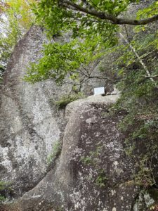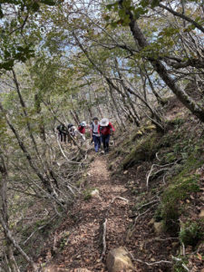 準備体操を済ませ、茅葺屋根の古民家が並ぶ集落をわき目に登山口を目指した。林道から続く登山道は、そこそこの急登であり、自然と歩行も遅くなったが、ブナの原生林の中での山登りは、すがすがしいものがあった。途中休憩をはさんで世間話に花を咲かせ、疲れをいやしながら登っていくと大きな岩峰や岩場が目立つようになった。