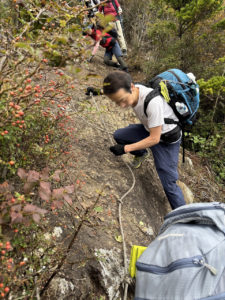 ロープ場も現れるようになり、しばらく進むと鍵掛峠に出て、そこから先はアップダウンが続く急登や岩場を縫うように尾根道は続いたが、健脚ぞろいが多いせいか、予定よりもだいぶ早く鍵掛に着いたので、ここでは昼食をとらずに王岳を目指すこととした。