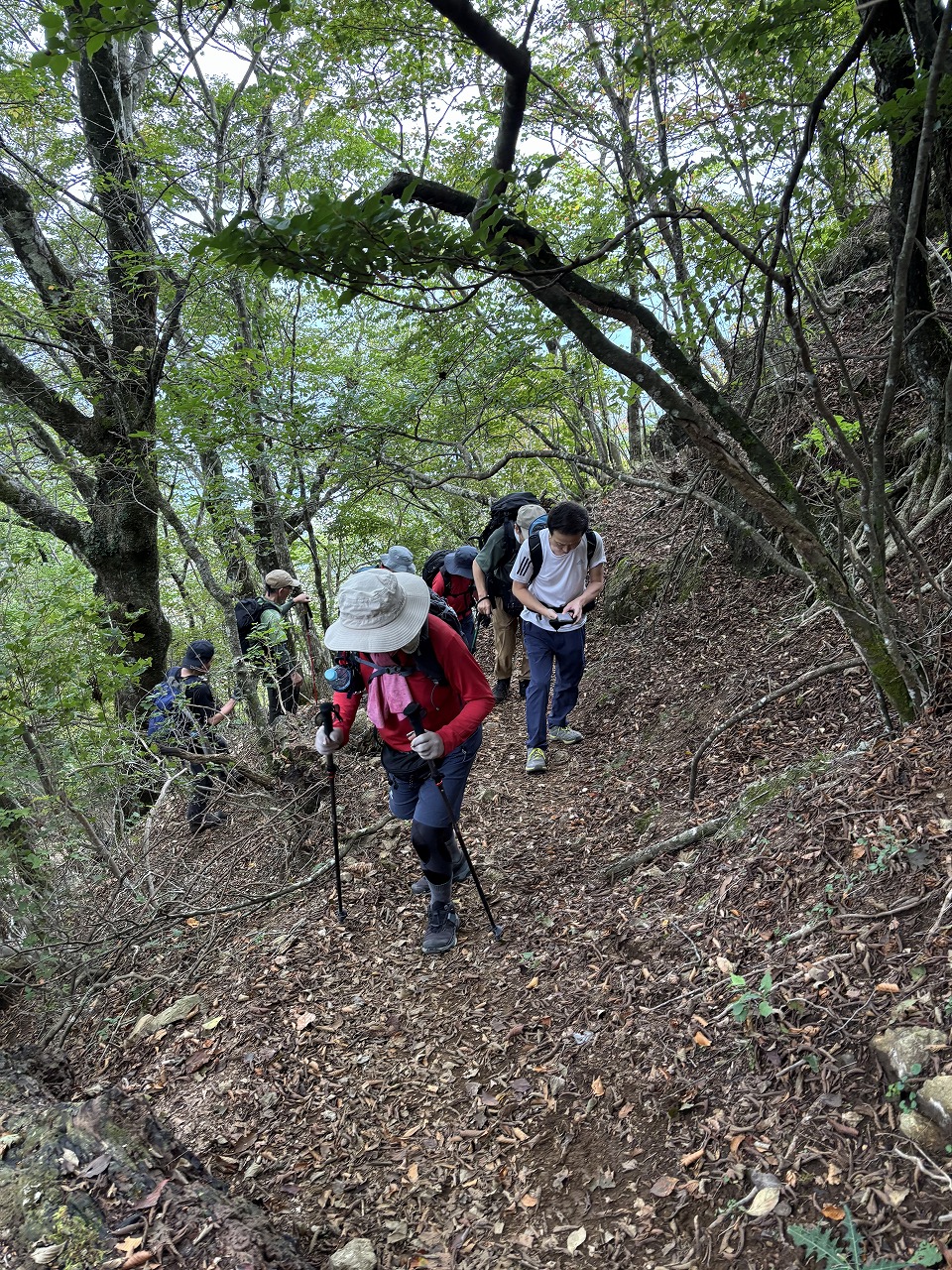 準備体操を済ませ、茅葺屋根の古民家が並ぶ集落をわき目に登山口を目指した。林道から続く登山道は、そこそこの急登であり、自然と歩行も遅くなったが、ブナの原生林の中での山登りは、すがすがしいものがあった。途中休憩をはさんで世間話に花を咲かせ、疲れをいやしながら登っていくと大きな岩峰や岩場が目立つようになった。
