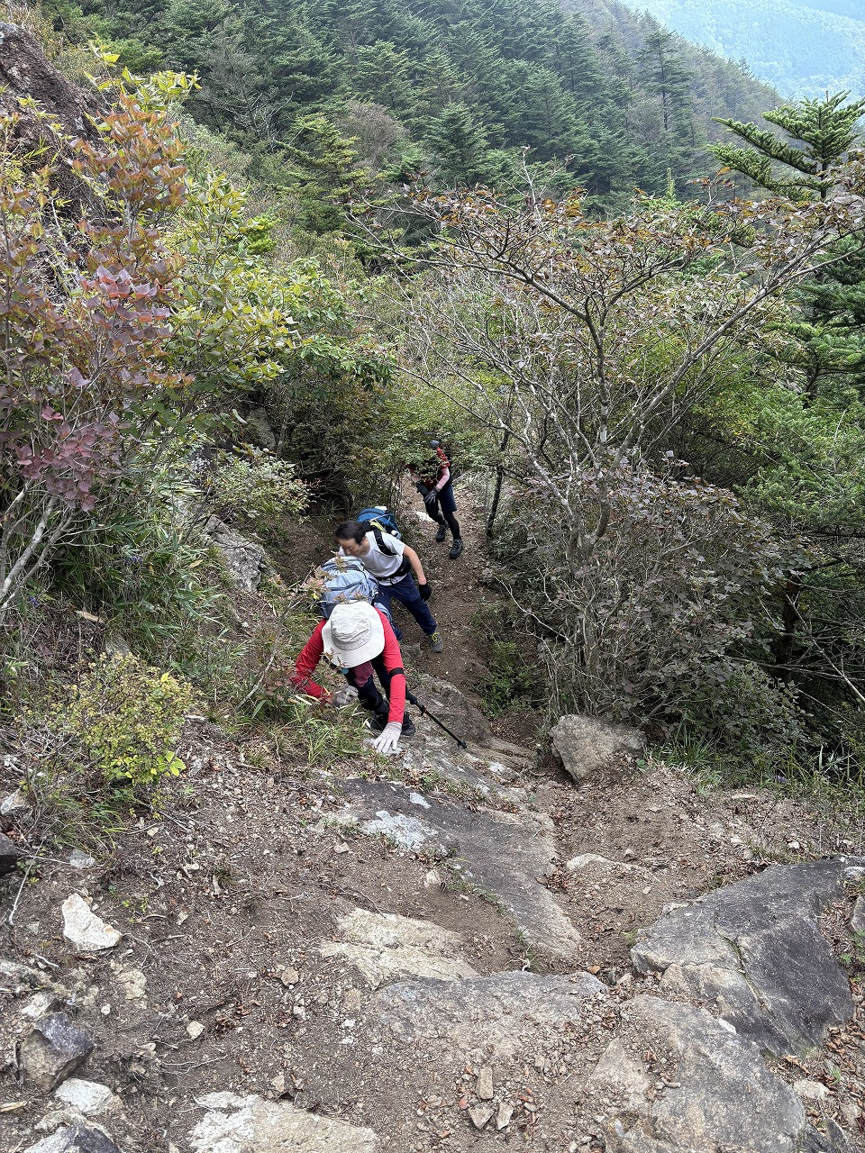 ロープ場も現れるようになり、しばらく進むと鍵掛峠に出て、そこから先はアップダウンが続く急登や岩場を縫うように尾根道は続いたが、健脚ぞろいが多いせいか、予定よりもだいぶ早く鍵掛に着いたので、ここでは昼食をとらずに王岳を目指すこととした。