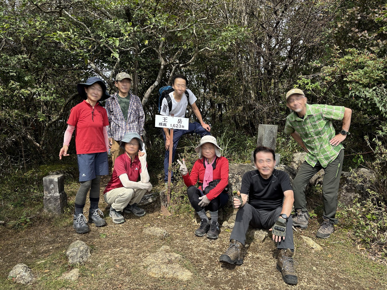 王岳の山頂手前には、大きな岩峰が行く手を阻むように立ちはだかり、そのわきを進むように登山道は続いていたが、ここが今回の一番の難所で、足場の少ない岩場を慎重に通り過ぎた。この難所を無事に通り過ぎ、しばらくすると王岳山頂にたどり着いた。ここで昼食をとることにし、MHさんのおすそ分けに舌鼓を打ちながら楽しいランチタイムを味わった。