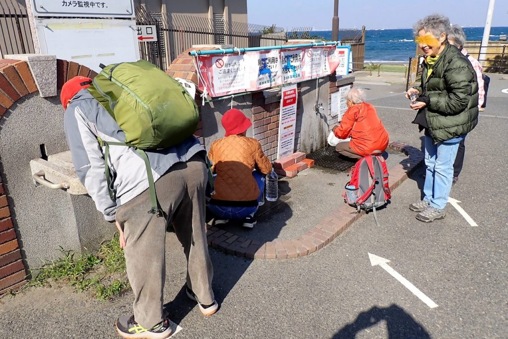 海岸線を少し歩くと走水水源地公園に入る。海を眺めながらベンチで一休みして再び歩き出すと、やがて芝生の切れたところに走水湧水の取水場があった。先客がいてポリタンクで取水をしていた。私たちも飲んでみたが甘みがあり、まろやかでやさしい味がした。小さなペットボトルに取水した参加者もいた。