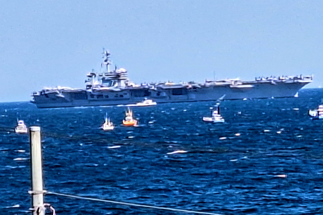 その代わり、本日10:00AMに横須賀基地を出港した巨大な空母ジョージワシントン(世界最大の原子力空母で排水量10.42万トン/全長333m/搭載機85機)が沖合至近距離を外洋に向かって進む姿が見えた。