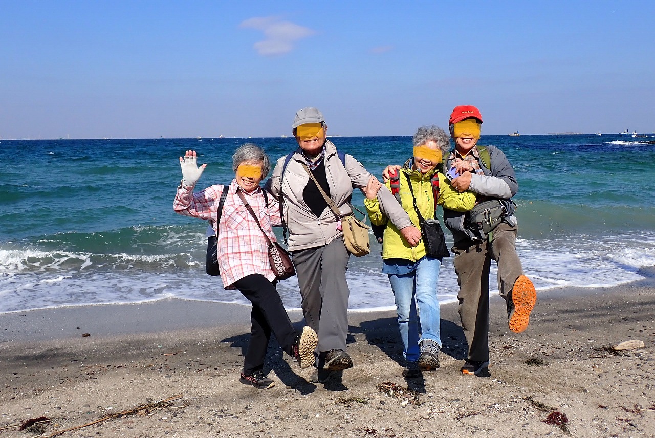 海岸線からやや陸地には入った馬頭観音堂から海岸に向かって10数分歩き、やがて青い海が見えだすと、メンバから口々に歓声が上がり「うわっ~海だア~」。心配された天候も終日晴天で寒くなく暑くなく、穏やかな日和で青い海が目に入ると気持ちが和む。