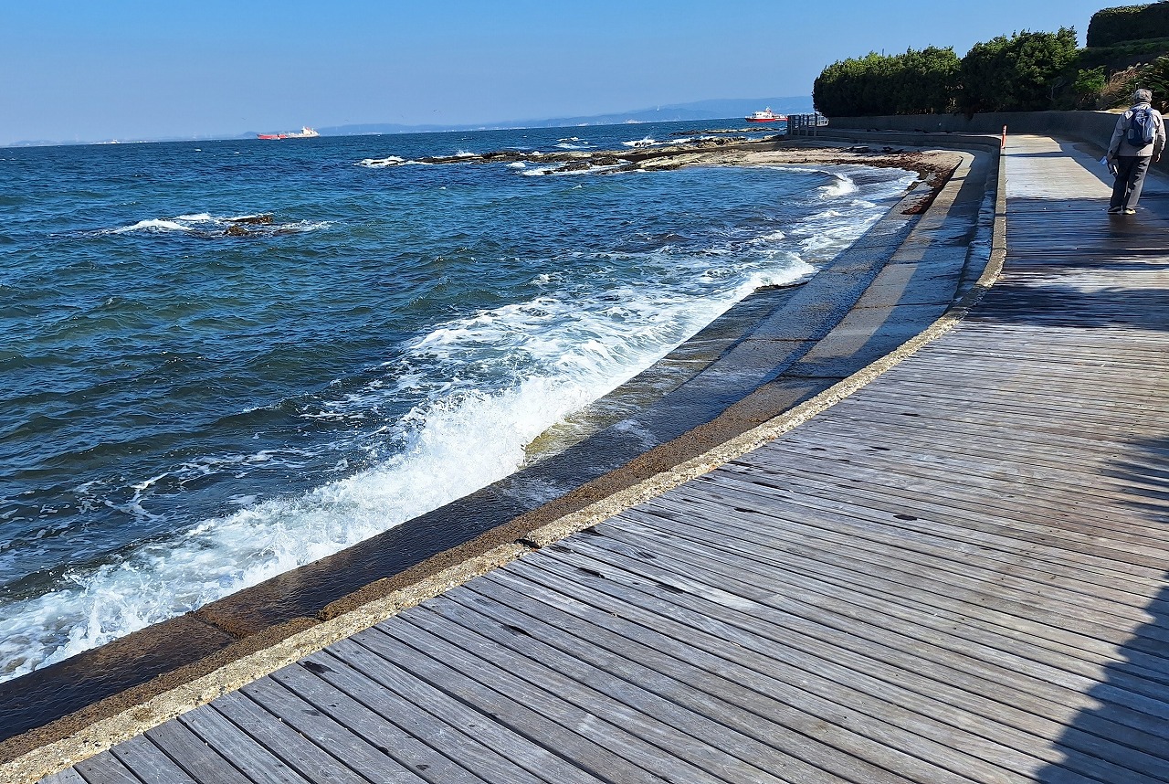 その後、速水海岸から観音崎海岸に至る波打ち際を繋ぐ約600m長のボードウォークを歩いた。潮の香りと、打ち寄せる波の水飛沫を全身に浴びながらのまさに「波打ち際の散歩」を存分に堪能することができた。