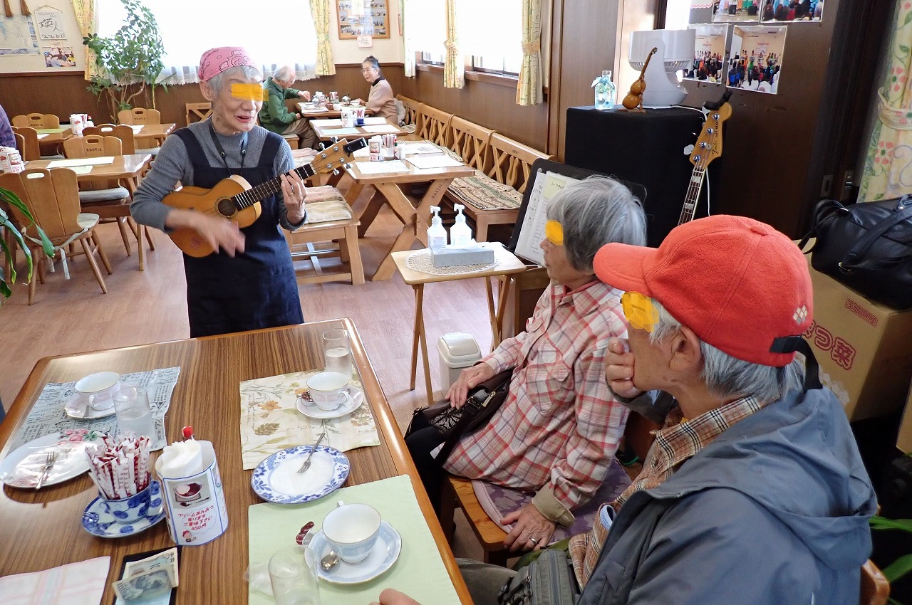 観音崎海岸から観音崎灯台に登って、大展望を楽しんだのち、往路を観音崎海岸まで戻った。予約しておいた観音崎バス停近くのカフェでコーヒータイムを取り、しばし疲れを癒した。ここで我々のために、サプライズサービスがあり、店主のマダムによるウクレレ演奏とハワイアンの名曲「カイマナ・ヒラ」熱唱ライブを楽しむことができた。