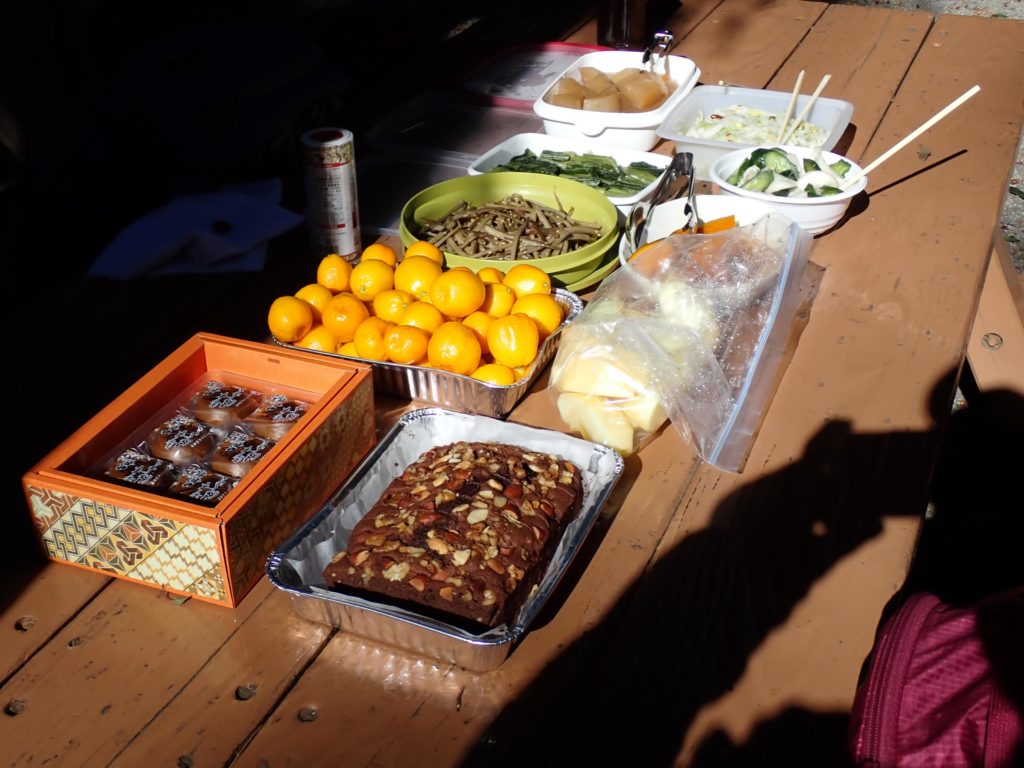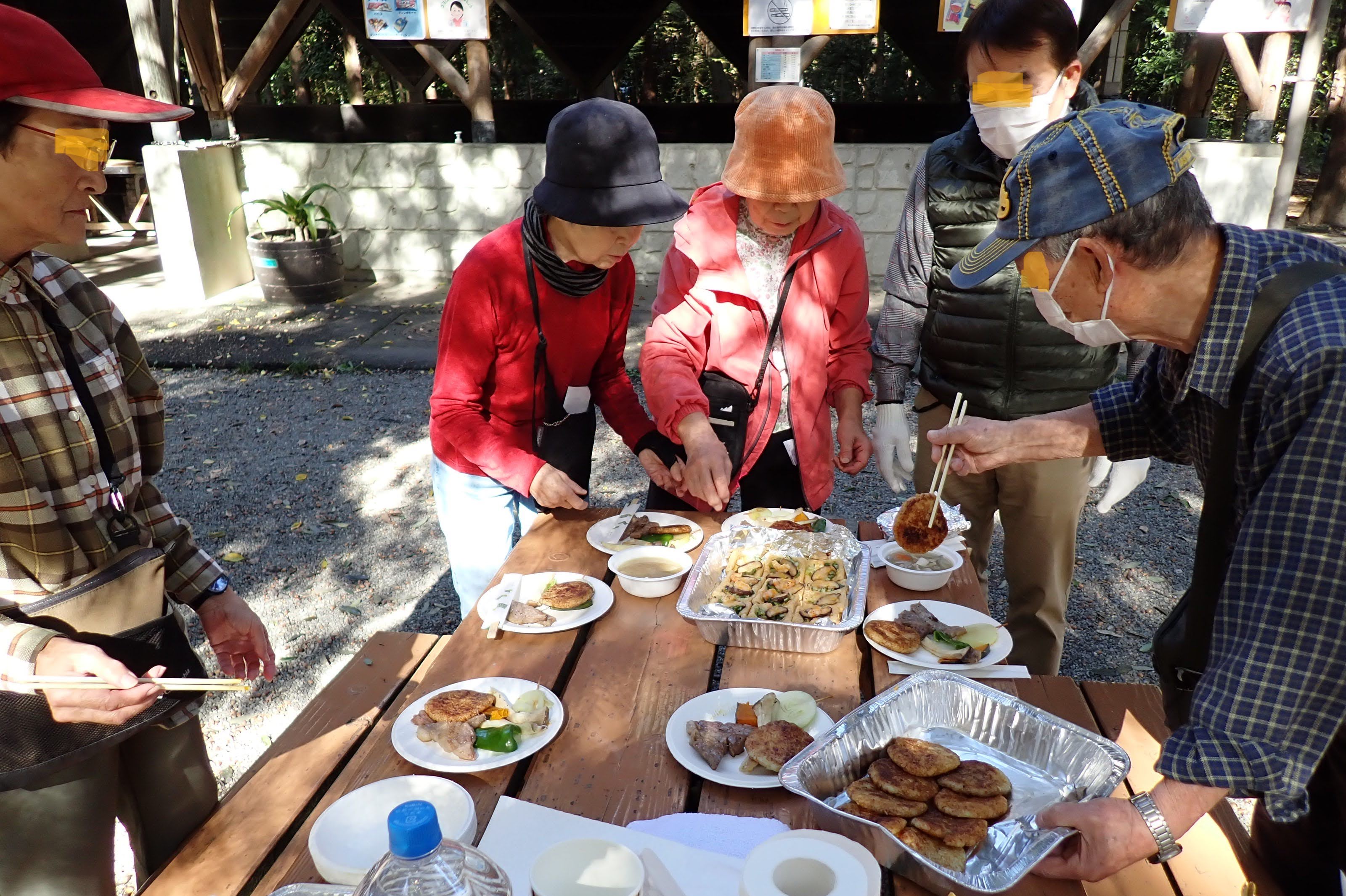 2つのかまどに火をおこし、鉄板と金網を熱し、持参のサーロインステーキ肉や野菜類、CL特製の五平餅風焼きおにぎり、この場所を紹介していただいたS.Kさんが自宅で調理して、車で運んで来てくれた豚汁や数々の総菜類、メンバが持ち寄った漬物、フル-ツ、ケーキ等のデザ-ト類も、屋外の3台のテーブルの上に並んだ。男性陣は主に火おこしと焼き物・調理当番。女性陣は主として、配ぜん担当。12人分の肉や野菜を調理し、熱々のうちにみんなで食べるために、調理担当の男性陣はかなり忙しく立ち振る舞わらなければならなかった。食後には、女性メンバによる淹れたてのコ-ヒのサービスもあった。全員そろって、おいしい昼食のひと時を楽しみ、持参の食材もほぼ完食したようだ。食事後、ハ-モニカの名手KTさんの伴奏で、なつかしい山の歌や童謡をひとしきり合唱して、約3時間の忘年昼食会を楽しんだ。