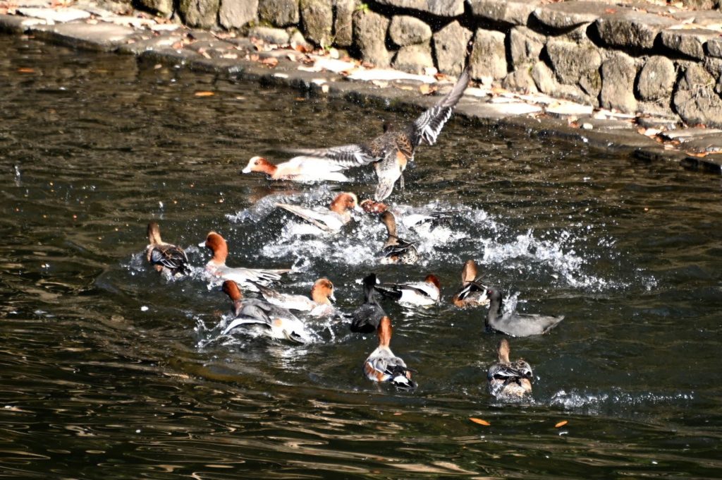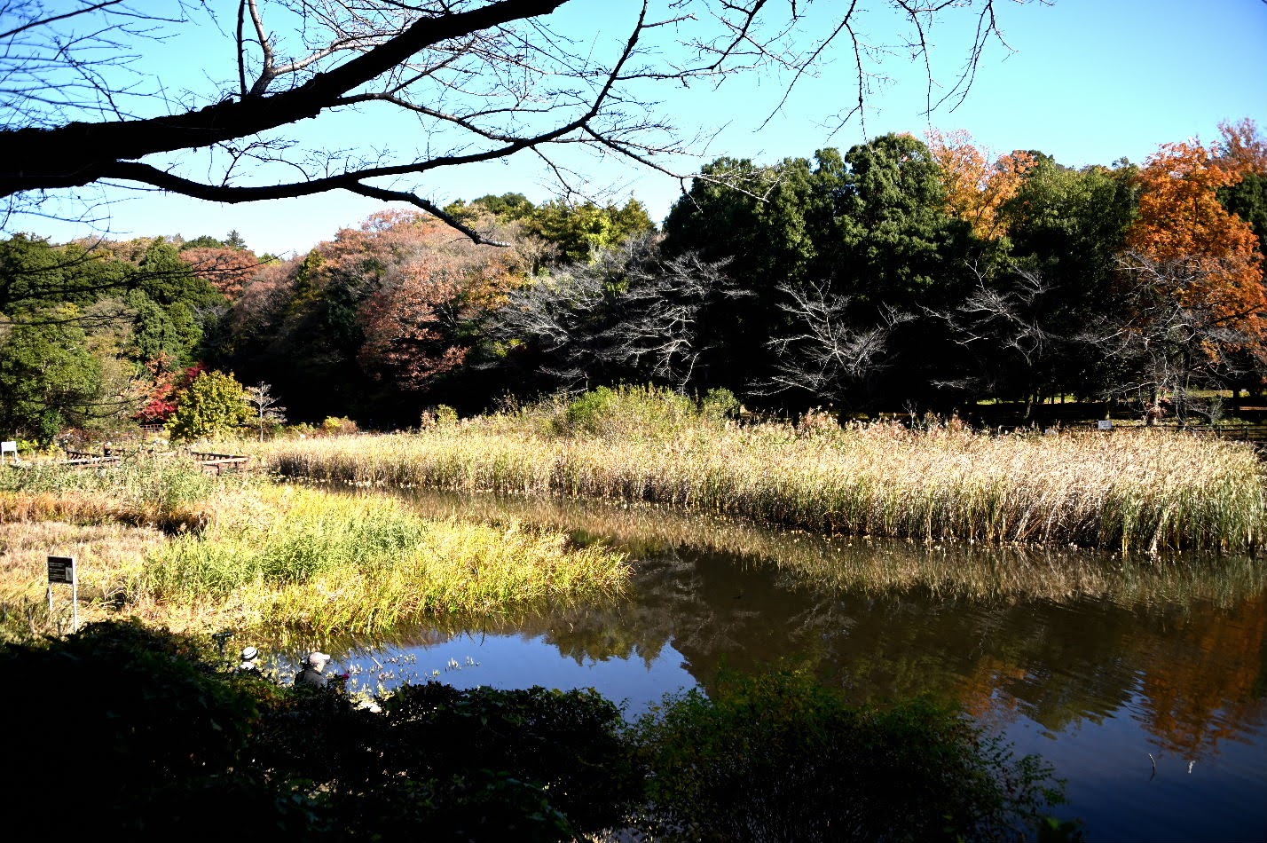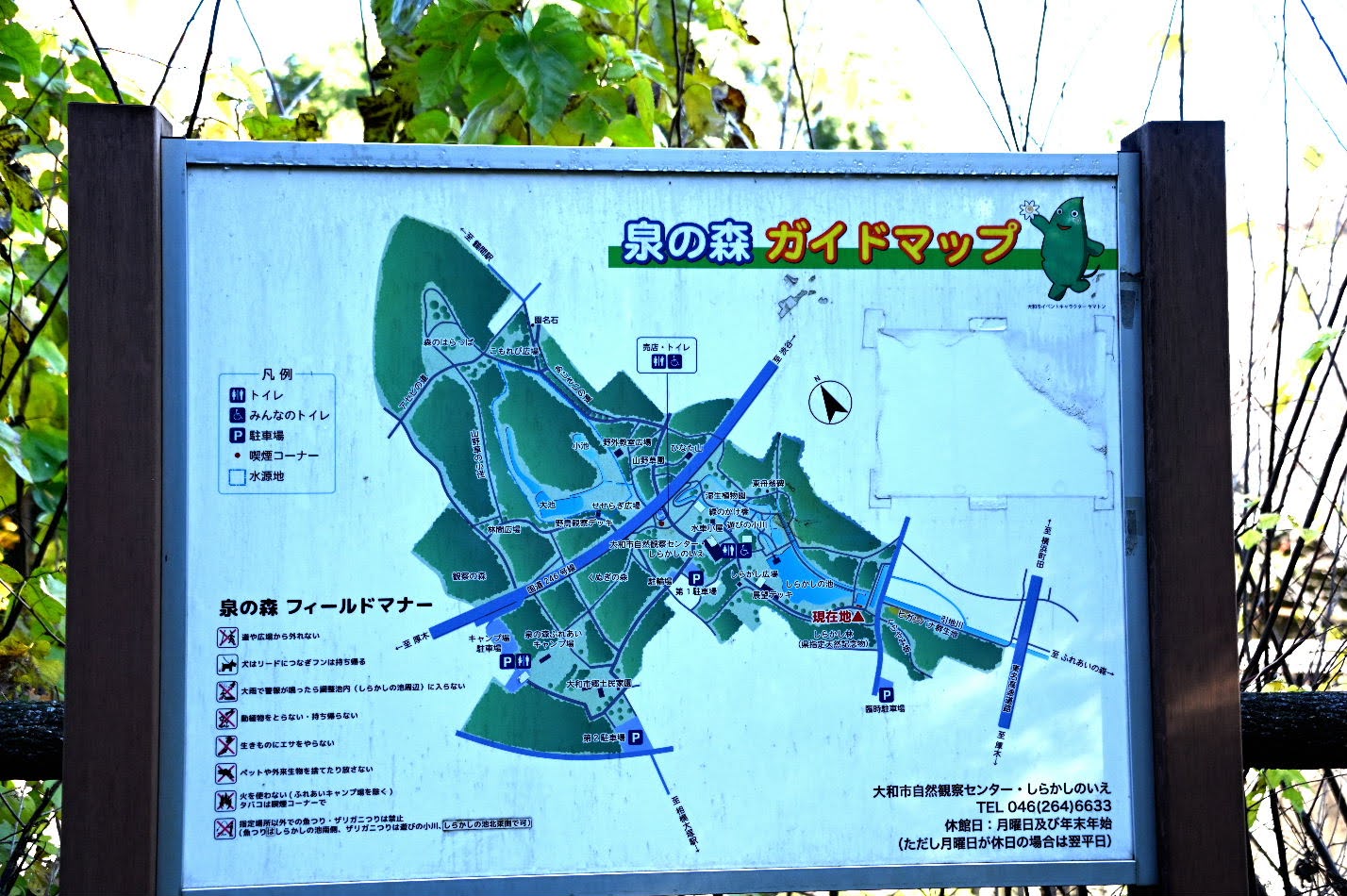 泉の森公園は、厚木基地の滑走路北端から北に約1~3kmの位置にあり、引地川源流を含む南北約2km、東西約1km、東京ド-ム9個分の48haの広大な広葉樹の自然林と、引地川をせき止めた調整池や谷地の湿地帯等から構成されている。横須賀基地を母港とする米軍空母からの艦載ジェット戦闘機による厚木基地滑走路で繰り返されてきた耳をつんざく大音響を発するタッチ・アンド・ゴ-訓練を中止するよう長期間交渉が行われていた最中の1964年、現在の泉の森公園近くの工場にジェット戦闘機が墜落した。工場が大火・全焼し、住民3人が死亡する大惨事が発生したことを契機に、付近の土地を国が買い取り、泉の森公園としての整備が始まり、1997年に全面開園したという。28年前に開園した新しい公園であるためか、知名度が低く、近くに住むTTCメンバに紹介されて、存在を初めて知った。今回参加メンバ12名中11名が初訪問となった。