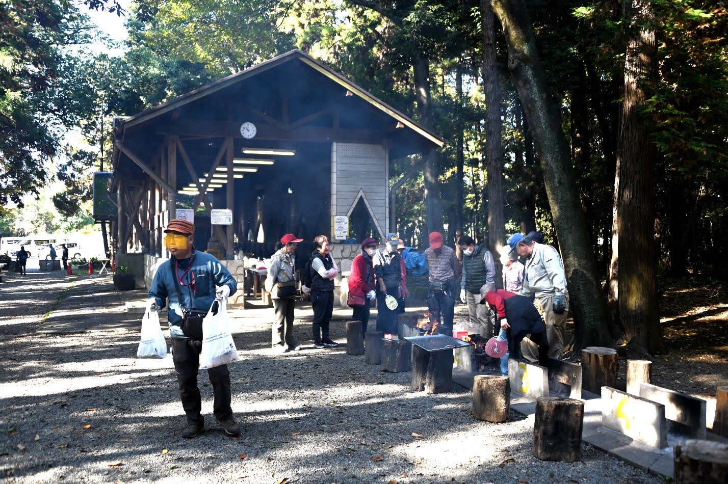 会場として、近隣の自然豊かな森の中で、調理道具一式は現地でレンタルでき、食材のみ持参すれば、実施できる場所を捜したところ、泉の森公園内のふれあいキャンプ場を探し当てた。人気のキャンプ場では、土日はどこも混み合うことから、12月の平日に実施できる場所を探し、この場所で実施すことに決めた。しかし、現地キャンプ場の予約交渉をする段階で、12~2月の冬季の平日は、営業を休止することが判明したため、忘年会には少し早いが、11/26(水)に繰り上げ実施することにした。