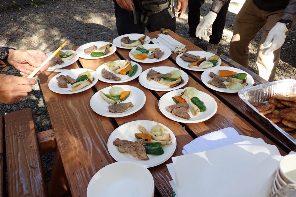 本日のキャンプ場の利用者は、TTC12名の他、保育園の子供たちと先生・保護者の40人ほどの2組のみ。休日はなかなか予約が取れないほど混み合うらしいが、今日はゆった~り楽しめた。調理に必要な鉄板や網、まな板、包丁、トング、鍋、やかん、お玉等はキャンプ場の備品として、無料で貸していただいた。薪と炭、鉄板をきれいに磨く専用のクレンザ-はここで購入する必要があった。