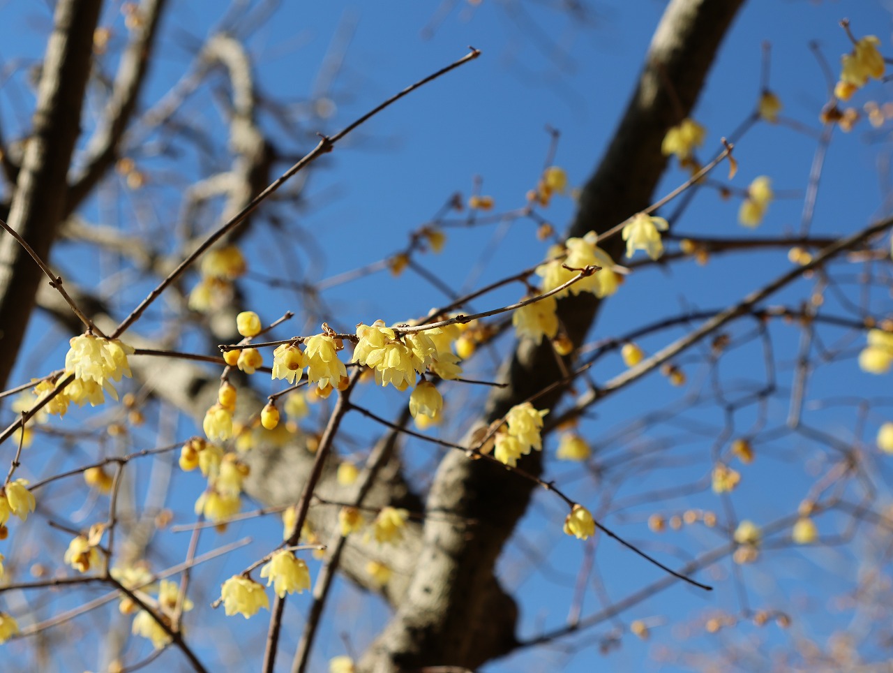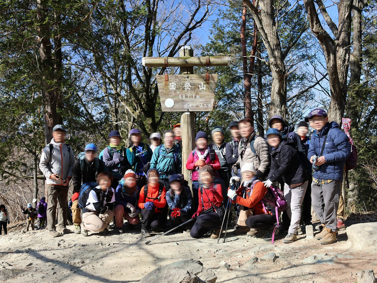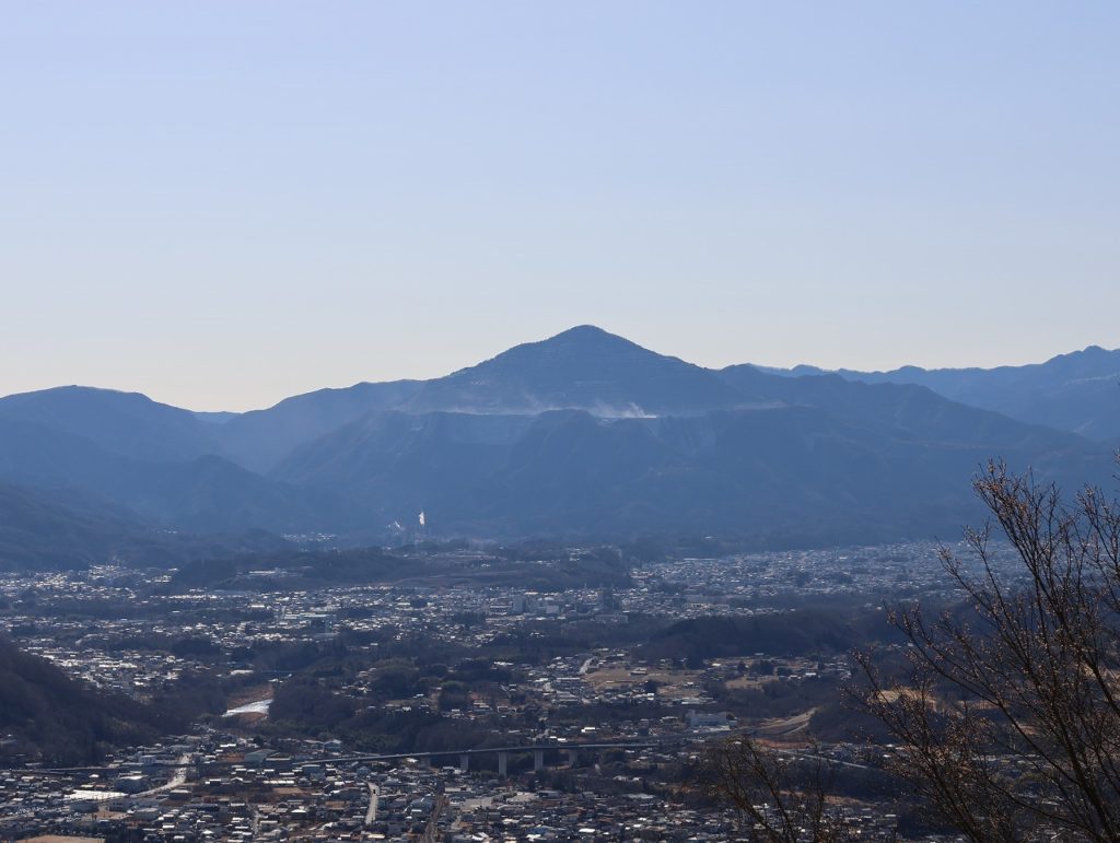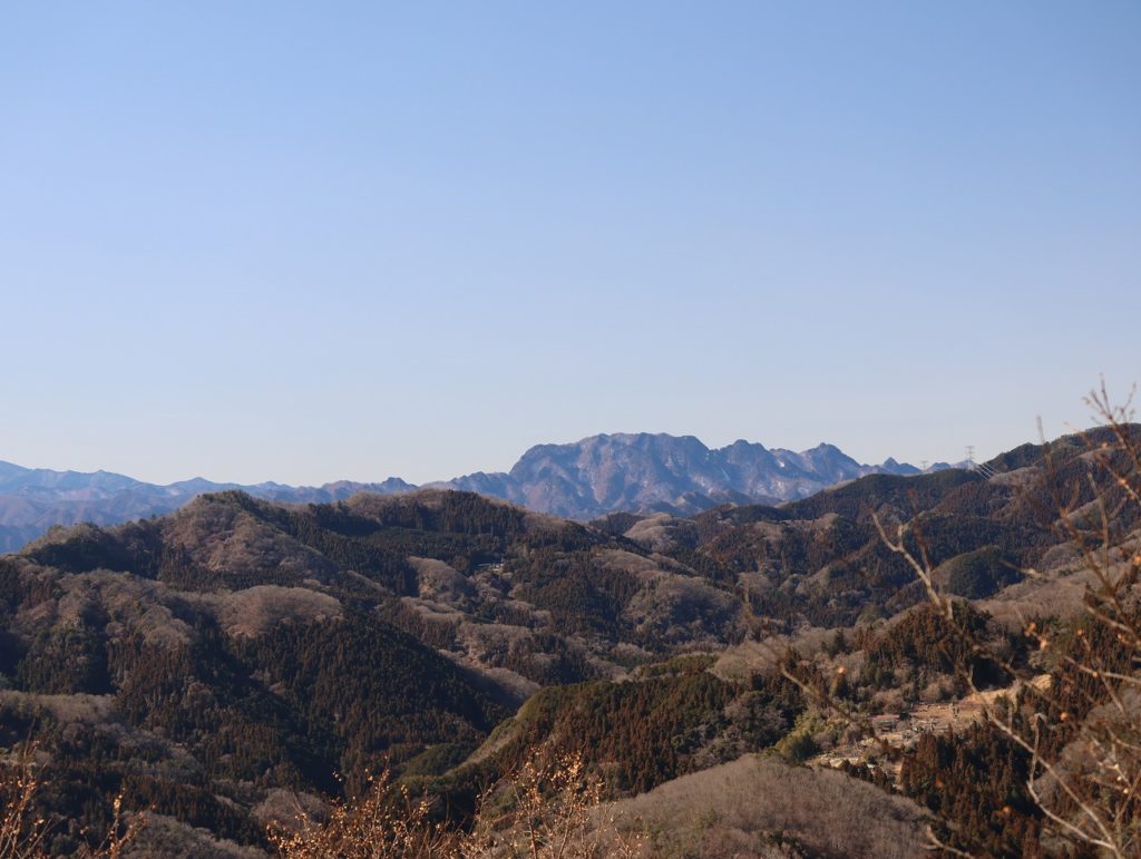木洩れ日の中、森林公園のような登山道を気持ちよく歩き、林道を経て宝登山入口に到着。そこからは続く階段上りをひと踏ん張りし、ほどなく山頂に到着。残念ながら今回のお目当の一つである山頂のロウバイは、今年は開花が進まずまだ3分咲きであったが、雲一つない好天に恵まれ、武甲山や荒川、両神山などが良く見え眺望は抜群であった。宝登山神社の奥宮とロウバイ園を回り、SUSABINOテラス付近で昼休憩とした。