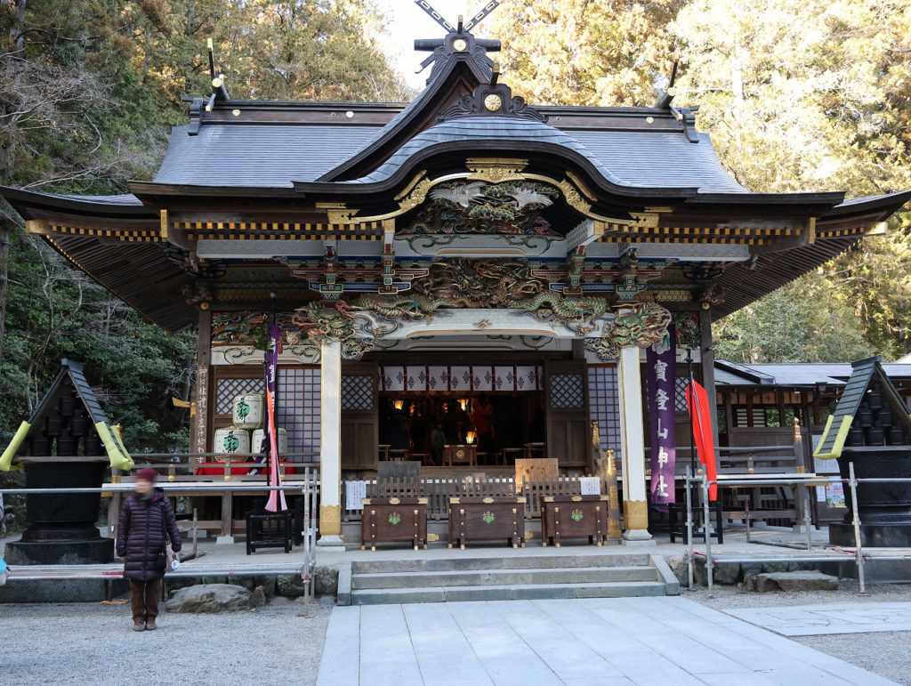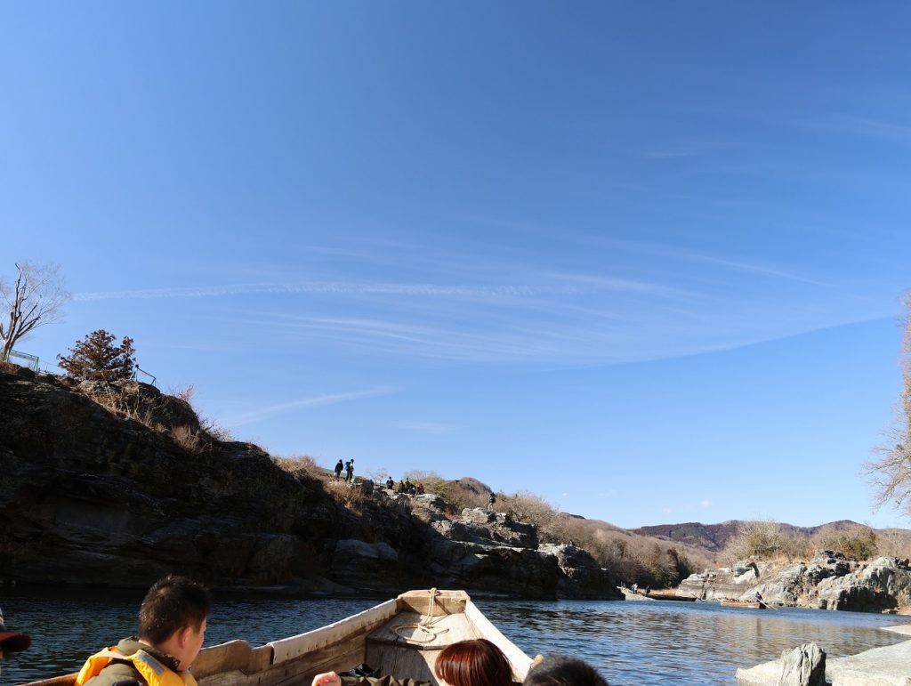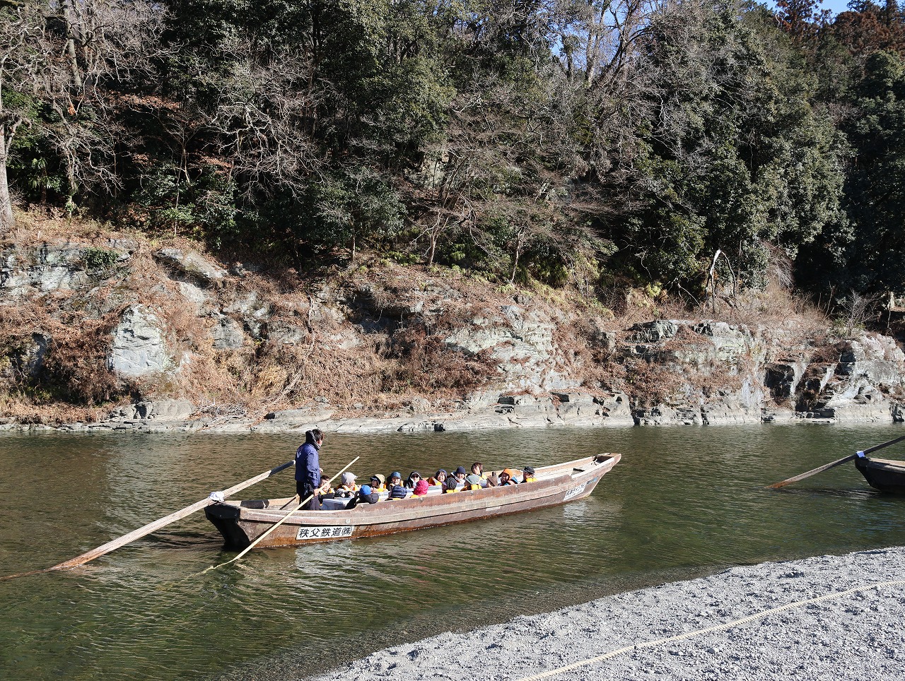 下山は歩いて40分。下山した所に秩父三社の一つ宝登山神社(他三峯神社、秩父神社)があるがこたつ船の予約時間の都合上素通りし、そのまま岩畳を目指した。幸い風も弱く、予定通り乗船することができ、こたつに入りながら、ゆったりと20分ほどの岩畳周遊を船で楽しんだ。