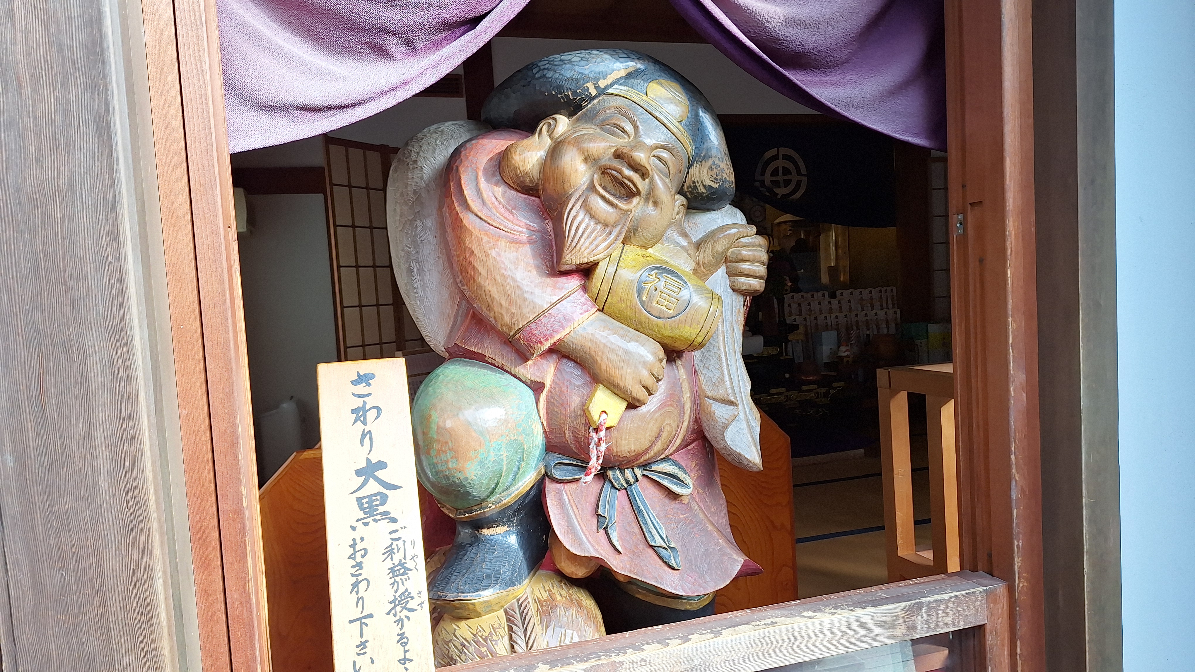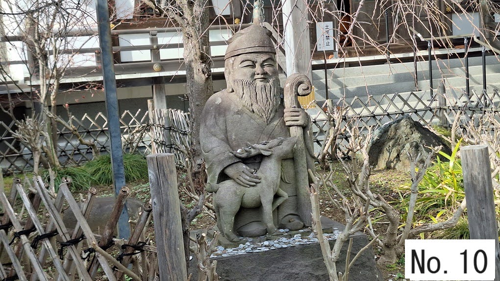 小町大路を南に5分ほど進むと、次の目的地日蓮宗「妙隆寺」に着く。境内右手のお堂の中に、牡鹿に乗って扇子を持った、健康と長寿の神で、欅の一本造りの「寿老人像」が祀られていた。どちらの寺社でもそうだが、堂内の祀られている貴重な仏像は、写真撮影が禁止されている。この寺の場合、七福神巡りをする人へのサ-ビスとして、本堂の前庭に寿老人の石像が設えてあった(写真10)。さらに小町大路を南に進むと、1436年創建の日蓮宗本覚寺があり、日蓮上人の遺骨がこの寺に分骨されていることから、東身延と呼ばれて信仰を集め、壮大な本殿を構えている(写真11)。山門を潜った右手に、ユニ-クな屋根の「えびす堂」(写真12)があり、この堂内に眼光鋭い「夷尊神」(恵比寿)が祀られていた。