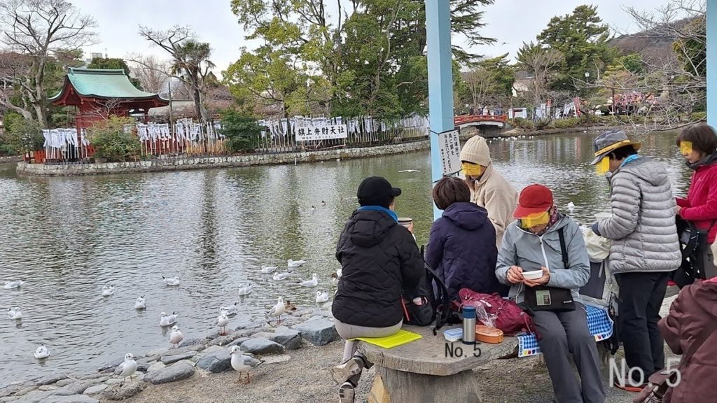 鎌倉街道(県道21号)を南に約30分歩くと鶴岡八幡宮の裏口に到着する。参拝客で混み合う本殿(写真3)に参拝し、石段下の舞殿で催されていた神代神楽をしばし鑑賞した(写真4)。源氏池畔の藤棚下のベンチで昼食を摂ってから(写真5)、源氏池の小島に祀られている旗上弁天社を参拝(写真6)、源頼朝が祀った琵琶を奏でる裸弁天財像(鎌倉時代作)は鶴岡八幡宮国宝館内に展示してあるそうだ。