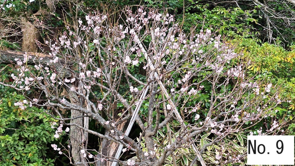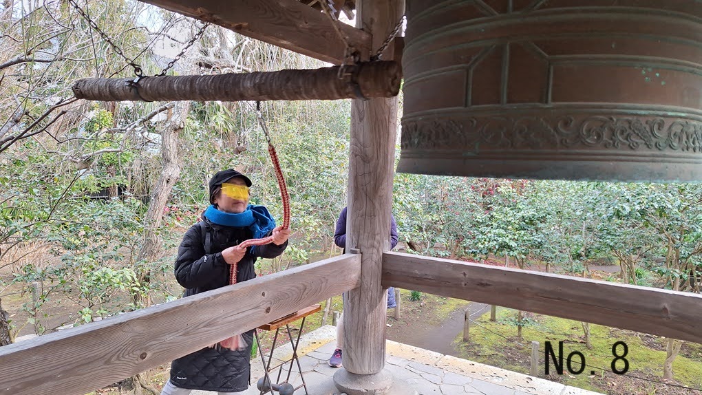 鶴岡八幡宮の三の鳥居を左折して5分ほど歩くと右手に鎌倉時代のメイン道路「小町大路」に出会う。その丁字路から、次の目的地「天台宗宝戒寺」の参道が延び(写真7)、山門を潜った先の本堂内に案内されると、中央に本尊「子育経読地蔵大菩薩坐像」(重文)あり、その左手に七福神の一人で、勝運・来福の四天王神「毘沙門天」が勇ましい姿で鎮座していた。なお、この寺は、新田義貞によって滅ぼされた鎌倉幕府の執権北条九代の菩提を弔うため、後醍醐天皇の命により、北条氏の邸宅跡のこの地に、創建された寺だという。鐘楼を自由に撞いてよいとのことで、大半のメンバが貴重な体験をした(写真8)。この寺は萩の寺としても有名だが、まだ1月初旬だというのに、超早咲きの梅が見事に花を咲かせていた(写真9)。