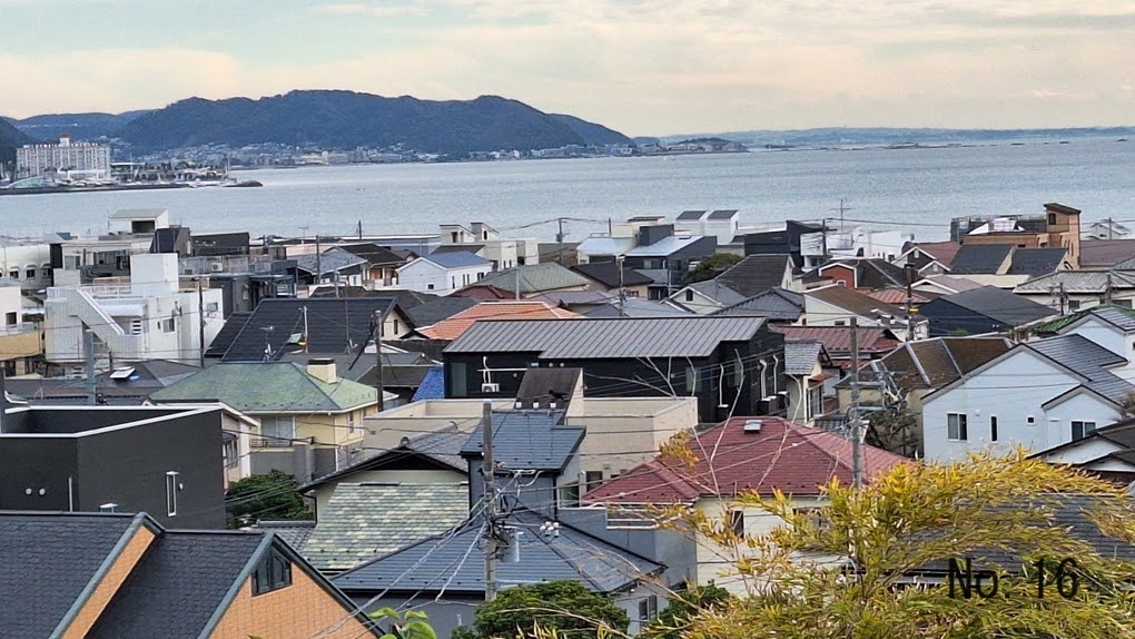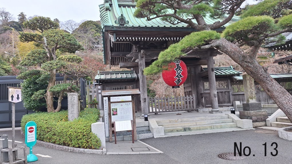 江ノ電で長谷駅まで移動し、至近の高台にひときわ目立つ長谷寺に向かった。山門(写真13)を潜って石段を登り切った高台に、長谷寺のシンボルの像高9.18m・楠樹の一本造り「十一面観音立像」を本尊とする荘厳な長谷観音堂(写真14・15)に出会う。40年ほど前に鉄筋コンクリ-ト造で再築されたそうだが、堂内は、金色に輝く十一面観音立像を中心に、極楽浄土の世界をイメ-ジしたと言うだけあって、異次元の世界に迷い込んだ感を覚えた。