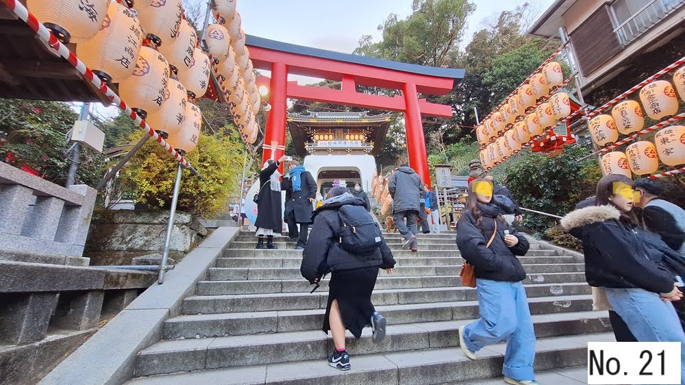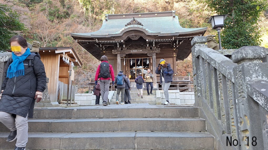 江ノ島駅で下車し、江の島弁天橋を渡って、江島神社の参道に入ると、若者を中心とした大勢の観光客で混雑する中、80歳代のシニアメンバを先頭に、石段を辺津宮まで登り切った(写真21)。江島弁財天を祀る奉安殿(写真22)に入場すると、日本三大弁財天とされる2体の江島弁財天、琵琶を抱えた裸弁財天「妙音弁財天」と劔を捧げた「八臂弁財天」(鎌倉初期作/重文)や弁財天を守る十五童子像等に手を合わせ、鎌倉・江の島七福神巡り最後の参拝を無事に済ますことができた。