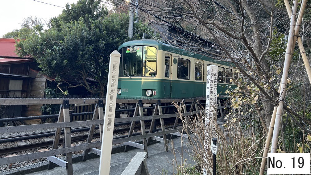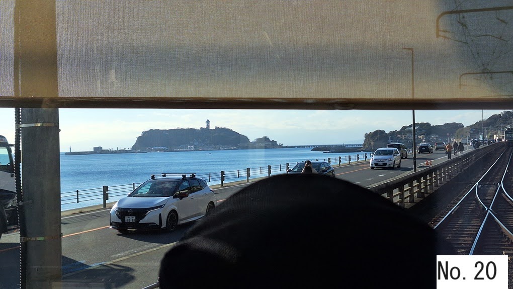 再度江ノ電に乗車し(写真19)、最後の目的地、江の島々内の江島神社辺津宮「奉安殿」(弁天堂)に向かった。長谷駅から江ノ島駅までの乗車時間は20分ほどだが、稲村崎を過ぎると七里ケ浜が間近に迫り、鎌倉高校前駅付近の踏切では、大勢の観光客が写真を撮る名所や海に浮かぶ江の島の景観(写真20)を4両編成の先頭車両の運転席後部に陣取って、存分に堪能することができた。