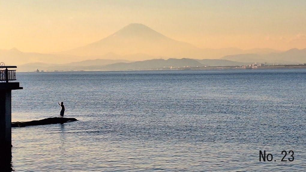 江ノ島弁天橋を渡って帰路に就くころ、曇りがちだった空が晴れ渡り、茜色に染まった空に浮かぶ幻想的な富士山のシルエット(写真23)にしばし見とれ、5.5年前リニュ-アルした竜宮造りの小田急片瀬江ノ島駅(写真24)から帰途に就いた。