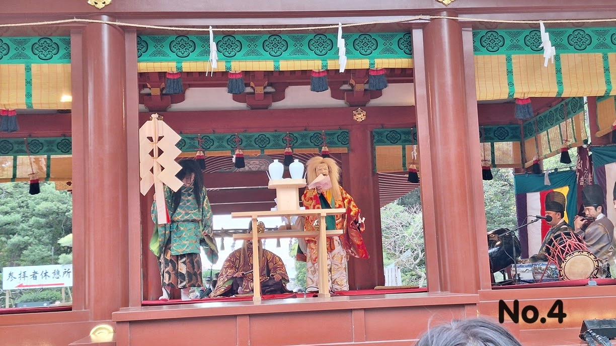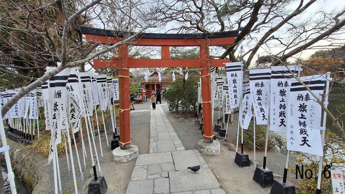 鎌倉街道(県道21号)を南に約30分歩くと鶴岡八幡宮の裏口に到着する。参拝客で混み合う本殿(写真3)に参拝し、石段下の舞殿で催されていた神代神楽をしばし鑑賞した(写真4)。源氏池畔の藤棚下のベンチで昼食を摂ってから(写真5)、源氏池の小島に祀られている旗上弁天社を参拝(写真6)、源頼朝が祀った琵琶を奏でる裸弁天財像(鎌倉時代作)は鶴岡八幡宮国宝館内に展示してあるそうだ。