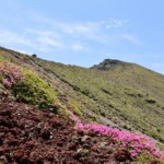1日目: “天孫降臨”の高千穂峰は、御鉢までと御鉢の縁をぐるりと回った後の山頂までが岩場とザレ場になっていて、特に下りは慎重に歩を進めなければならない。あちこちにミヤマキリシマが一面に広がっていて、事前情報では見ごろをむかえているとのことであったが、つぼみ、大きく咲いている花、ピークを越えた枯花、無残にも虫害に合っているものが混在していた。目の前には火山活動で入山規制されている新燃岳が噴煙を上げており、その先に明日登る韓国岳が雄姿を見せている。目を凝らすと山頂周辺がピンクに染まっており、楽しみである。